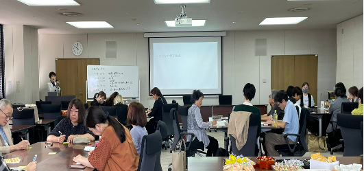 はじめに、コーディネーターの池田広子より、ラウンドテーブルの考え方、活動の特色、これまでのラウンドテーブルのご紹介をしました。その後、ラウンドテーブルの根底にある「おとなの学びとは?」について、5~6名のグループに分かれてブレインストーミングをしました。静かな会議室が一瞬にして活気あふれる会場に様変わりしました。