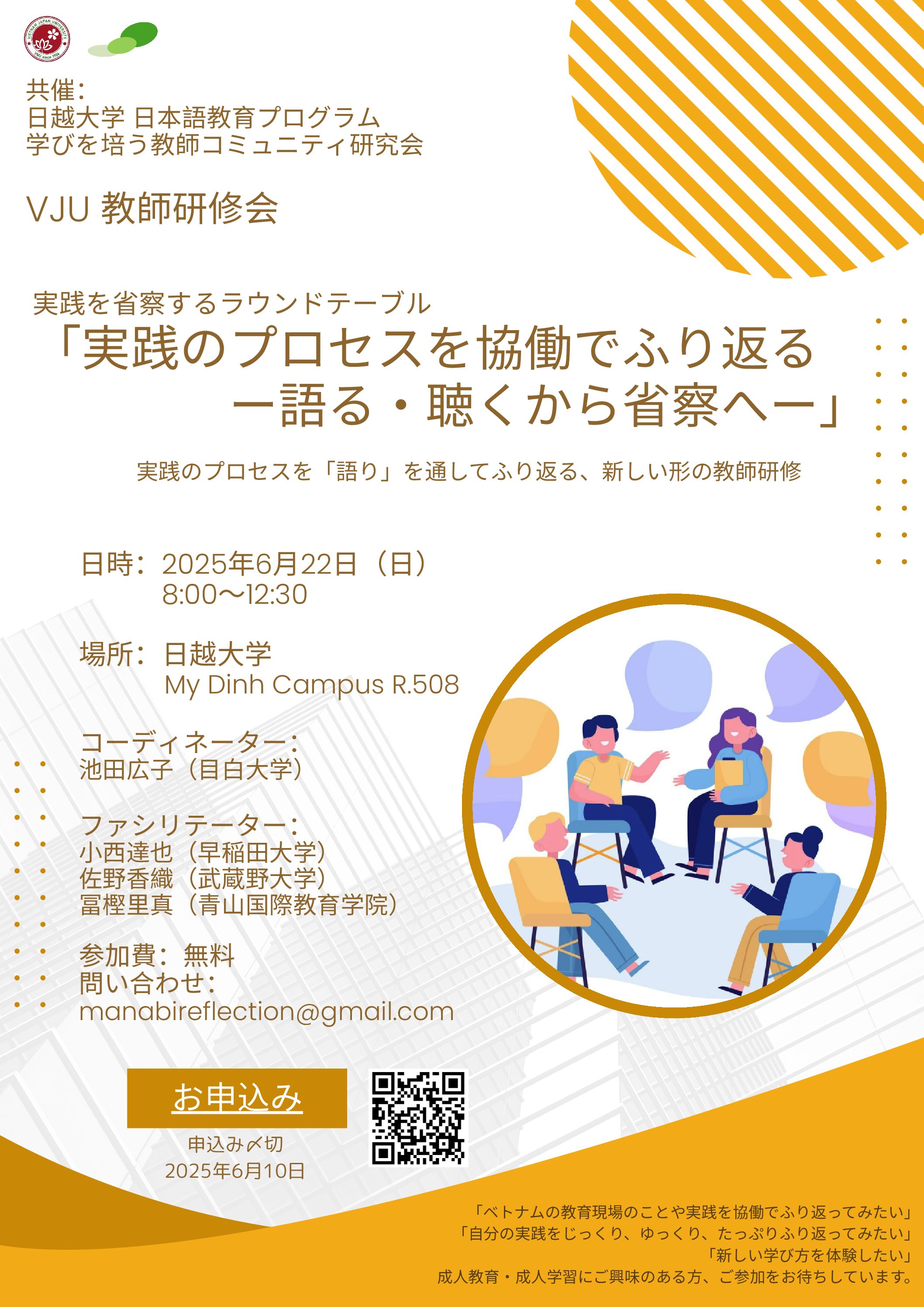 「実践を省察するラウンドテーブル2025初夏 ―ベトナム―『実践のプロセスを協働でふり返る―語る・聴くから省察へ―』」が、2025年6月22日(日)、ベトナムの日越大学にて開催されました。ベトナムでの開催は2年ぶり、ハノイでは今回が2回目となります。